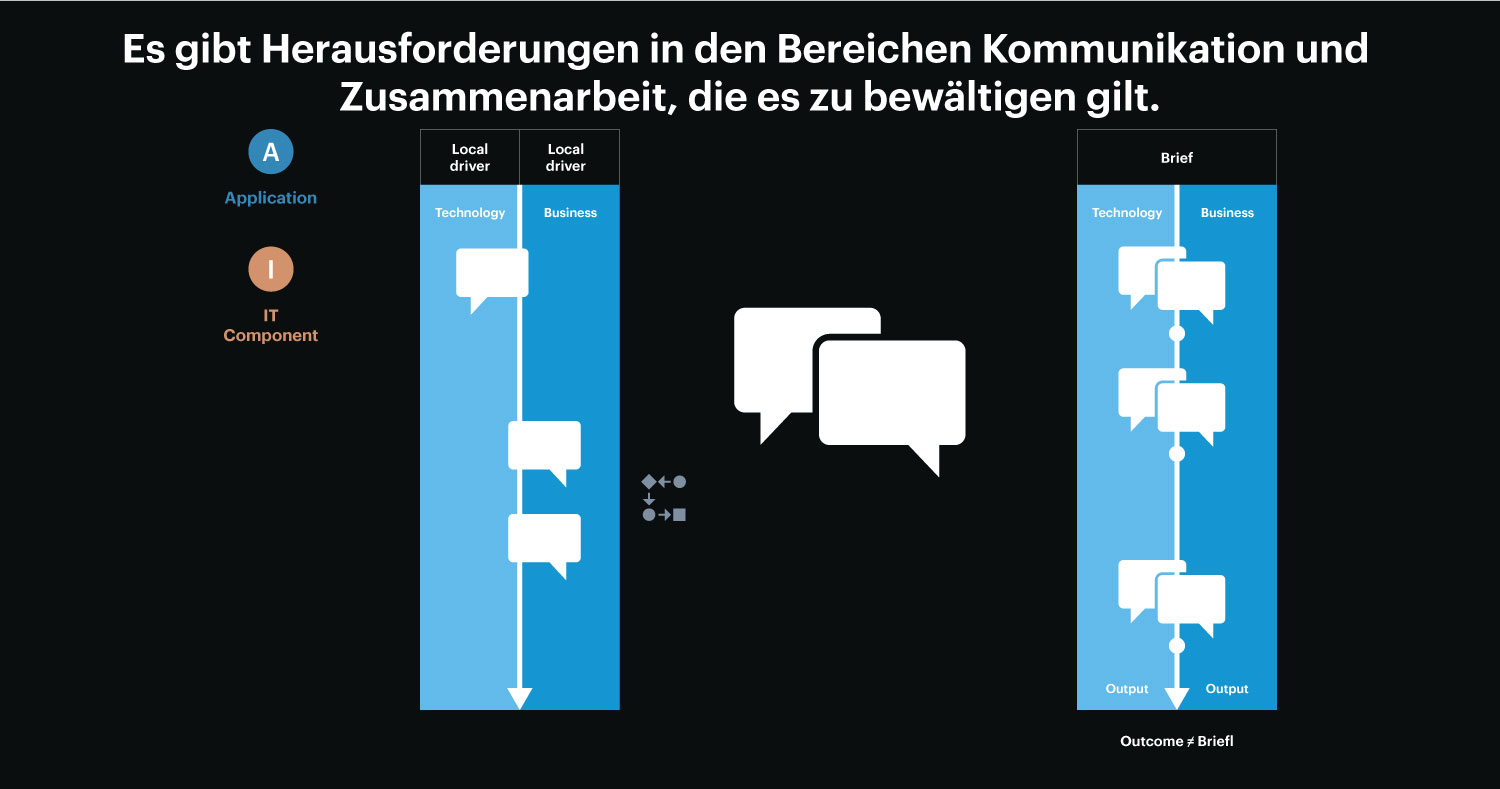 - Groß angelegte Transformationen: Selbst gut geplante, strategische Transformationen können unter Kommunikationsproblemen leiden. Eine gemeinsame Sprache und ein gemeinsamer Kontext sind unerlässlich, um sicherzustellen, dass alle auf dem gleichen Stand sind. Der Informationsaustausch erfolgt jedoch oft auf statische Weise, was die Abstimmung zwischen den Abteilungen behindert und somit den Erfolg der Initiative gefährdet.