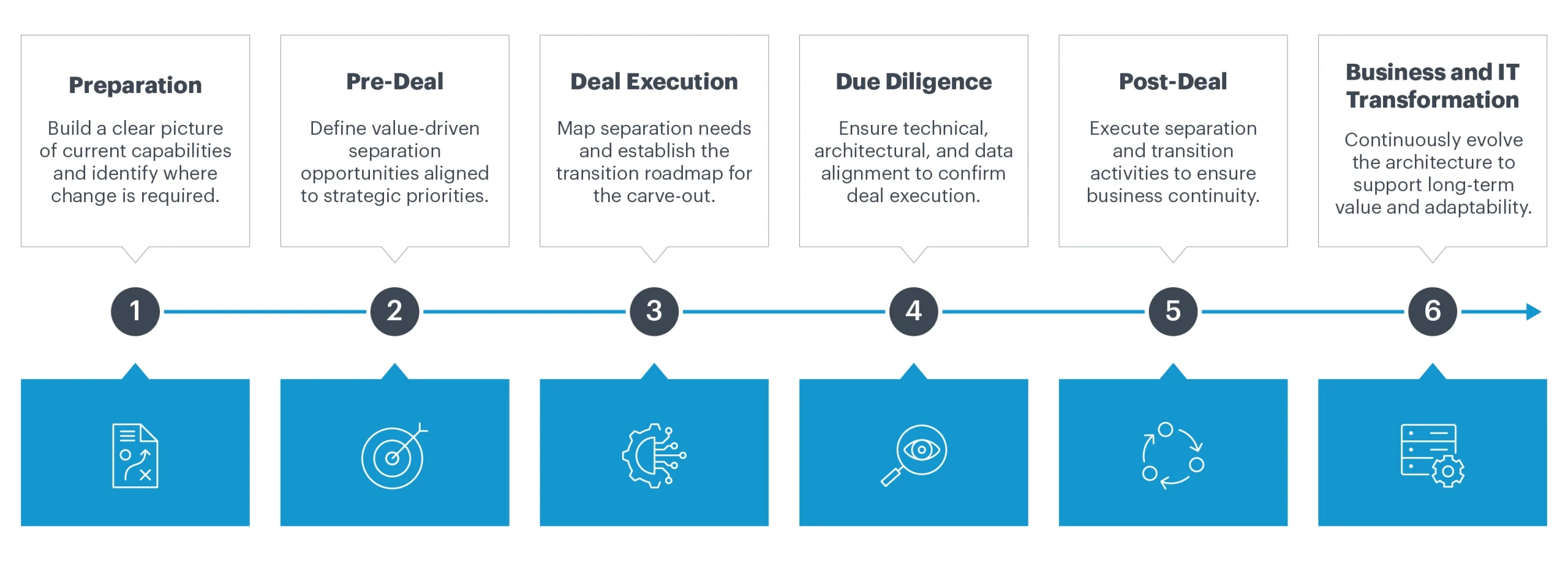 Divestitures benefit from a structured, enterprise-architecture-driven approach similar to M&A: beginning with pre-deal preparation and continuing through post-deal transformation. Enterprise architects shape decisions, reduce risk, and enable clean, controlled separation. Below is the six-phase process underpinning a well-governed divestiture.