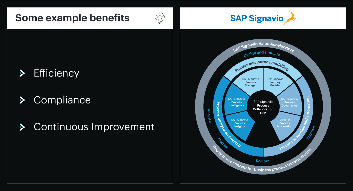 SAP Signavio focuses on process mining and modeling. It empowers organizations to map out processes, analyze their performance, and identify improvement opportunities, fostering efficiency, compliance, and continuous improvement.