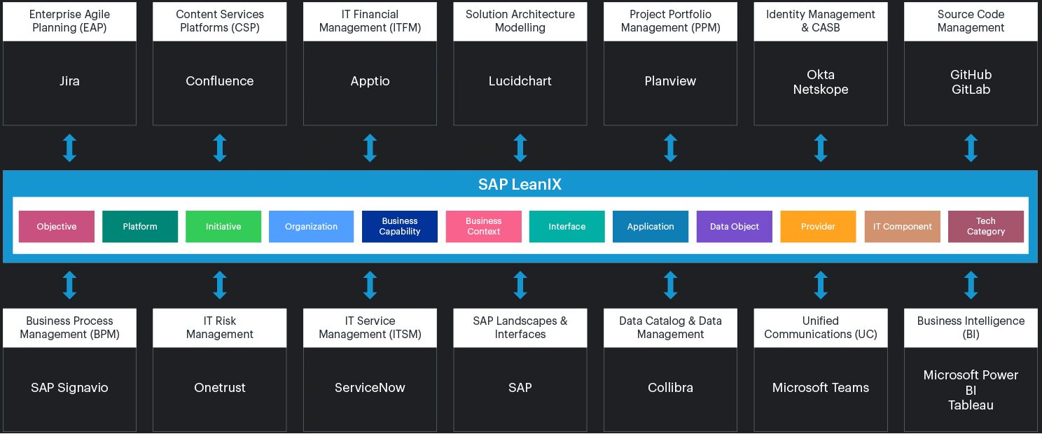 Below is a depiction of examples (usual suspects) of applications that could contribute to such an ecosystem (exemplified with LeanIX as the EAM application / digital twin technology).
