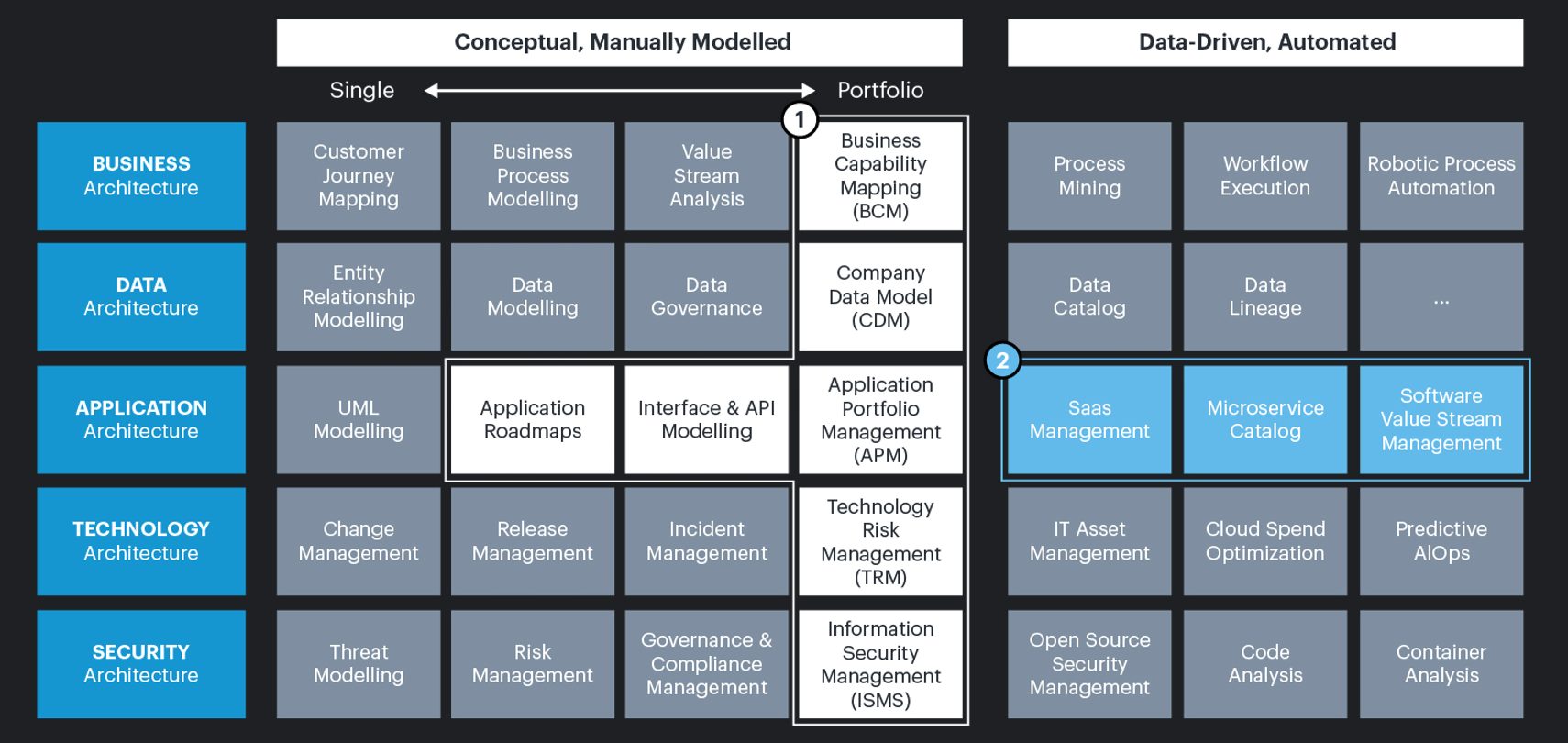Not all areas are equally mature from an EAM application capability perspective at present, but all are relevant dimensions of a digital twin of the enterprise.