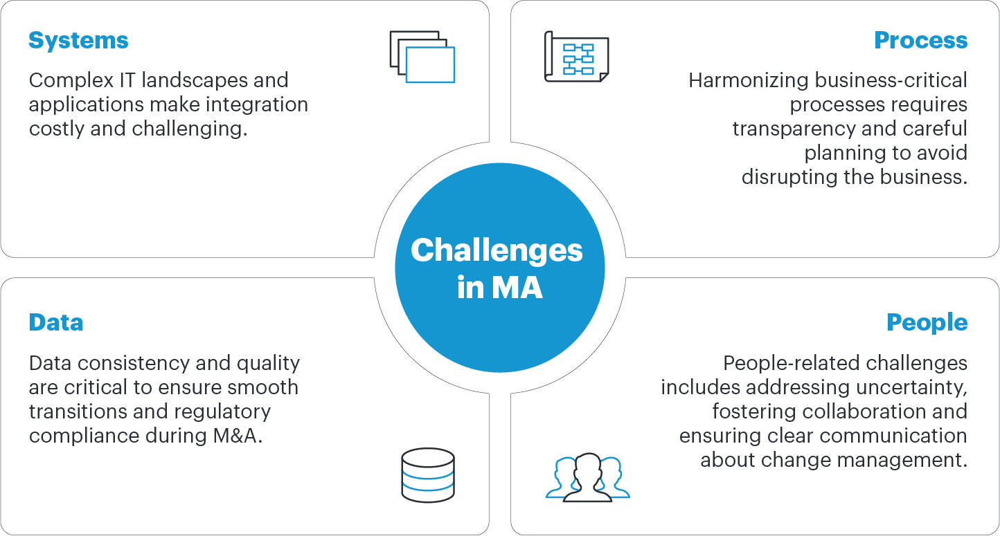Systems are usually the most visible challenge. Merging organisations often bring with them complex IT landscapes with multiple ERP systems, legacy applications, and interfaces built over years. Changes to systems immediately affect business processes, data structures, and user roles and without early transparency, making the right decisions becomes challenging.